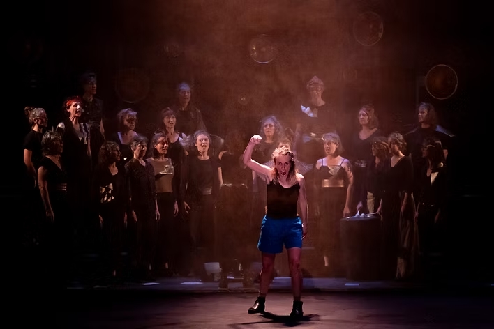 Elle s’imagine en chevaleresse qui traverse les âges, croyant devoir consacrer sa vie à une quête d’absolu en héroïne de l’Humanité. Le légendaire de ce personnage s’entremêle au parcours judiciaire de la victime, à la bête – représentation de la mémoire traumatique – et aux jeux télévisés sur fond de Pop Culture, image de toute une société. Du récit du traumatisme de son enfance, Nolwenn Le Doth tire un manifeste contre la domination et le silence où l’imaginaire tient une grande place, éclairant le lien étroit qui peut exister entre politique, justice et intimité. Parce qu’elle parle pour toutes, elle a souhaité s’entourer d’un chœur de femmes. Une armée de chanteuses amatrices, différente dans chacune des villes où le spectacle se joue.